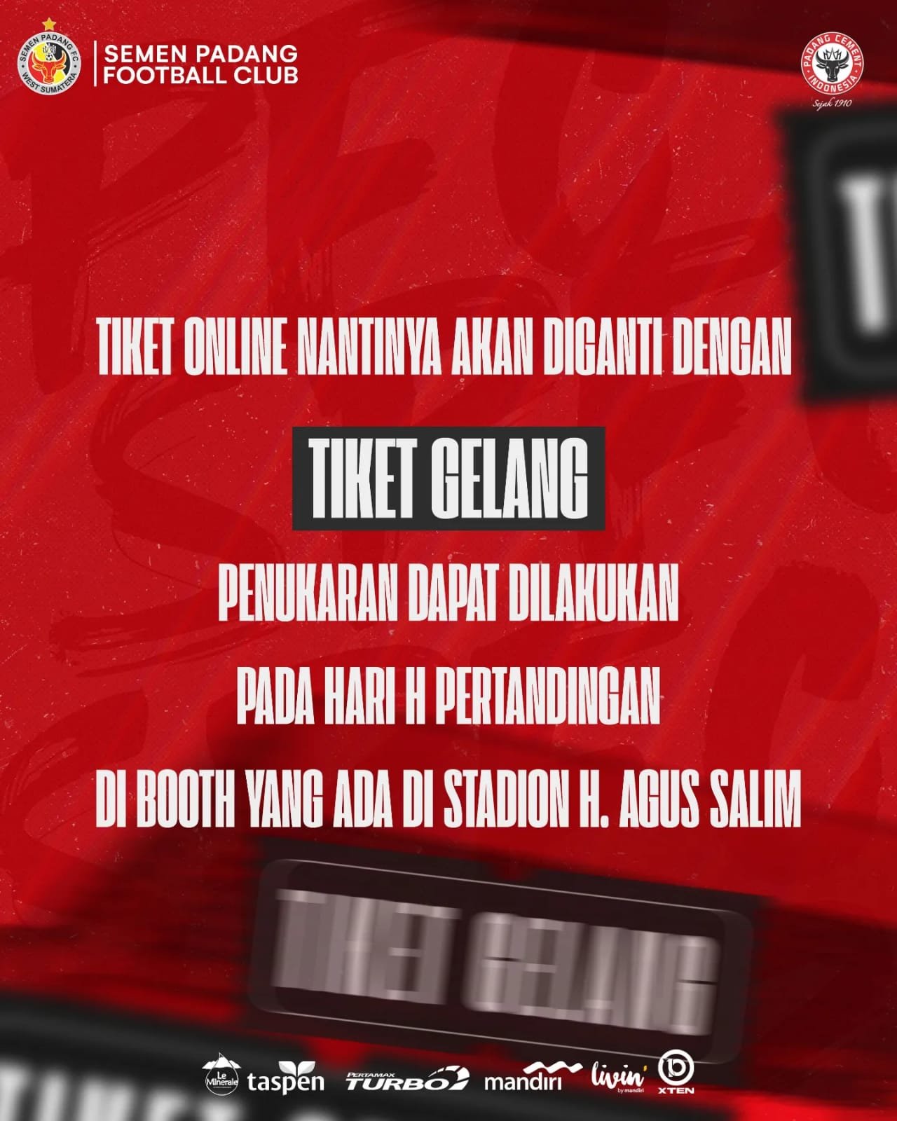 Penjualan Tiket Online Semen Padang FC Vs Perserang Telah Dibuka, Tiket Online Harus Diganti Dengan Tiket Gelang Pas Hari H Pertandingan